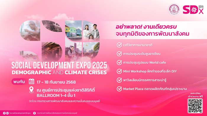 ขอเชิญประชาชนผู้สนใจเข้าร่วมงาน Social Development Expo 2025 (SDx 2025) ภายใต้หัวข้อ “Demographic and Climate Crises” ระหว่างวันที่ 17–18 กันยายน 2568 ณ บอลรูม 1-4 ชั้น 1 ศูนย์การประชุมแห่งชาติสิริกิติ์ เพื่อร่วมกันจัดการและหาทางออกจากวิกฤตซ้อนวิกฤต โดยเราทุกคนต้องร่วมมือ รวมพลังกัน เพราะไม่ใช่เป็นหน้าที่ของคนใดคนหนึ่ง หรือหน่วยงานใดหน่วยงานหนึ่ง ทั้งนี้ ติดตามรายละเอียดเพิ่มเติมได้ที่ เฟซบุ๊กกระทรวงการพัฒนาสังคมและความมั่นคงของมนุษย์ : https://www.facebook.com/share/1AVVt5UNCK/
