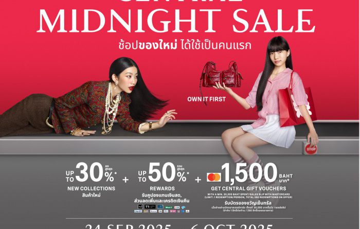 พบกับแคมเปญ “Central Midnight Sale : Own it First ช้อปของใหม่ ได้ใช้เป็นคนแรก” ตั้งแต่วันที่ 24 ก.ย. 68 – 6 ต.ค. 68 ที่ห้างเซ็นทรัลทุกสาขา และช้อปต่อเนื่องได้หลากหลายช่องทางการช้อปปิ้งสุดสะดวกของห้างเซ็นทรัล ทั้ง Central App ช้อปบนเว็บไซต์ www.central.co.th, ช้อปผ่านช่องทาง Central Chat & Shop, Call & Shop 1425 หรือช้อปผ่านเฟซบุ๊กไลฟ์และอินบ็อกซ์ของห้างเซ็นทรัล Facebook Page : Central Department Store คลิก https://www.facebook.com/CentralDepartmentStore หรือ Central Tiktok Shop