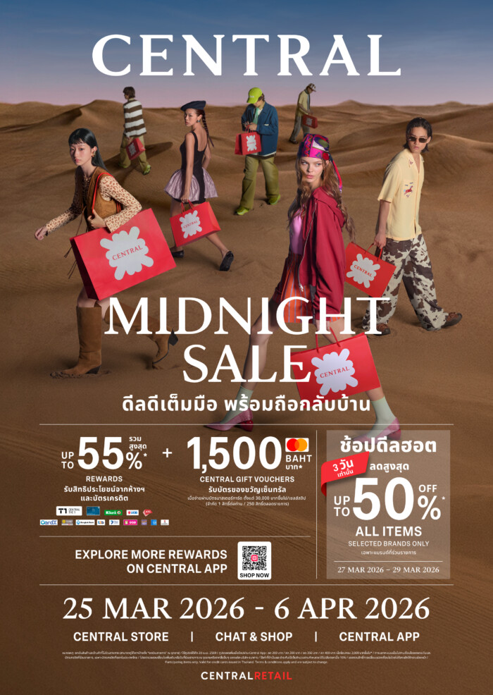 เตรียมกล้ามแขนให้พร้อม! แล้วมาช้อปปลุกกระแสถือถุงแดงเซ็นทรัลทั่วทั้งเมืองไปด้วยกัน กับแคมเปญ “CENTRAL MIDNIGHT SALE : BAG UP YOUR SUMMER ดีลดี เต็มมือ พร้อมถือกลับบ้าน” ระหว่างวันที่ 25 มี.ค. – 6 เม.ย. 2569 ที่ห้างเซ็นทรัลทุกสาขา หรือช้อปสะดวกผ่านทุกช่องทางช้อปปิ้งของห้างเซ็นทรัลได้ทุกที่ทุกเวลา ทั้ง CENTRAL APP, WWW.CENTRAL.CO.TH, CENTRAL CHAT & SHOP และ FACEBOOK / TIKTOK SHOP: CENTRAL DEPARTMENT STORE